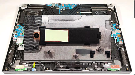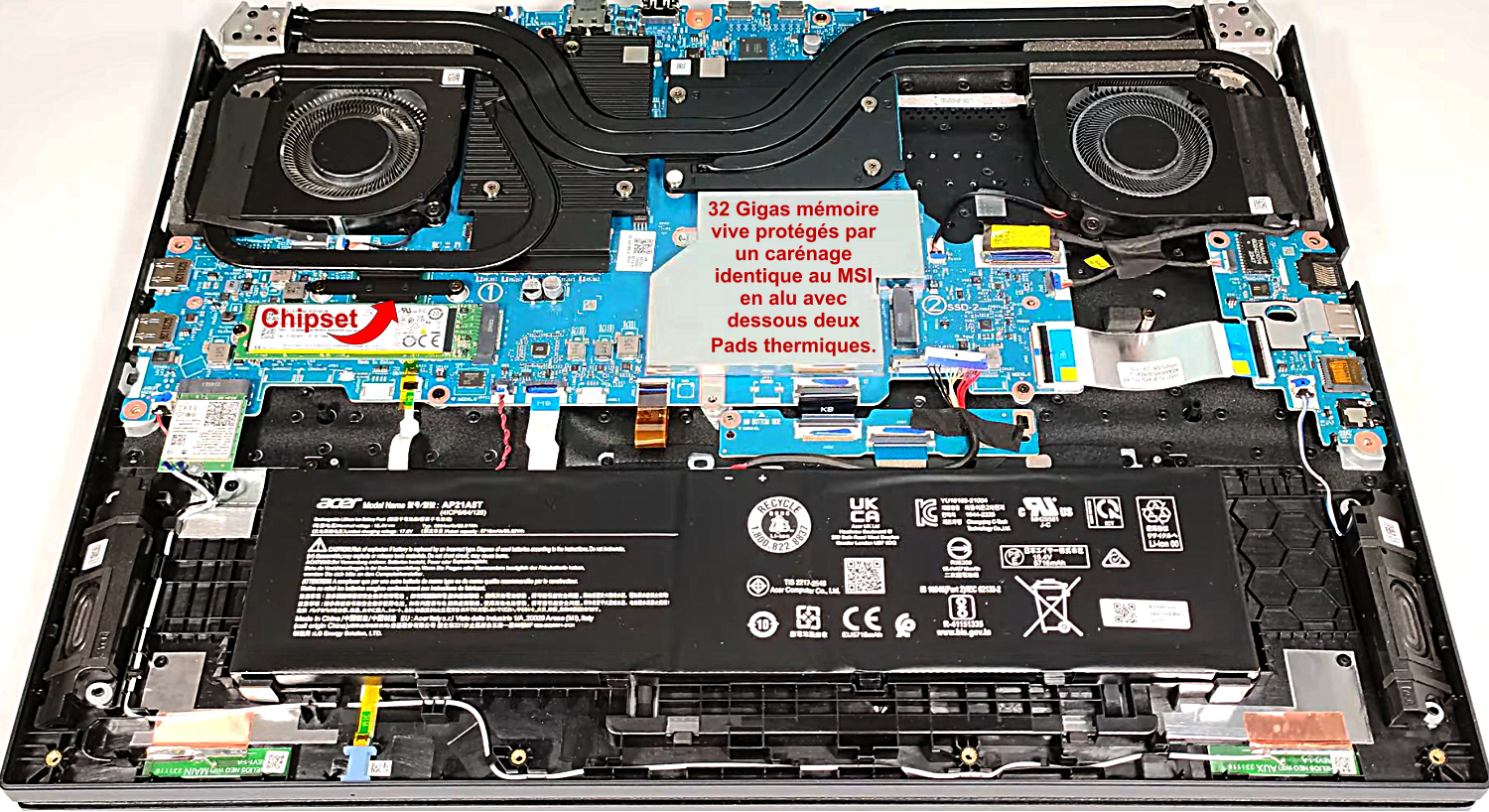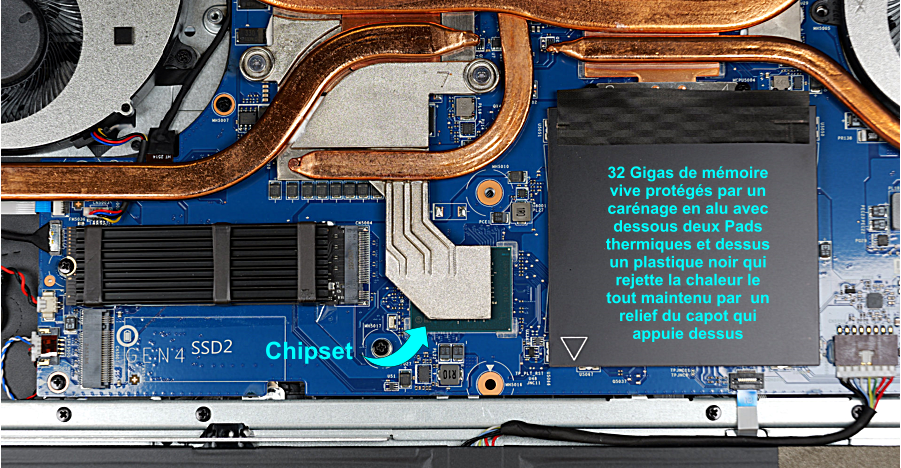 Emplacement SSD et Chipset indiqué par la flèche relié au gros refroidisseur thermique par Pad dessous
