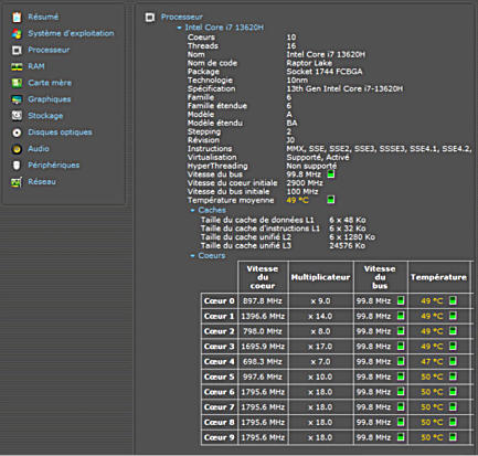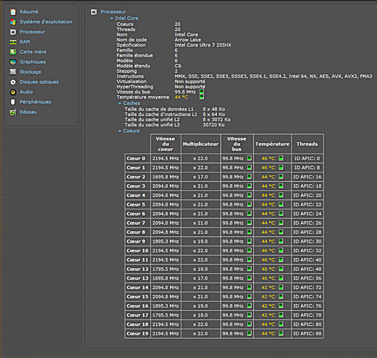 bien la température des 20 processeurs avec Speccy et celle du SSD avec CrystalDisk ce qui est